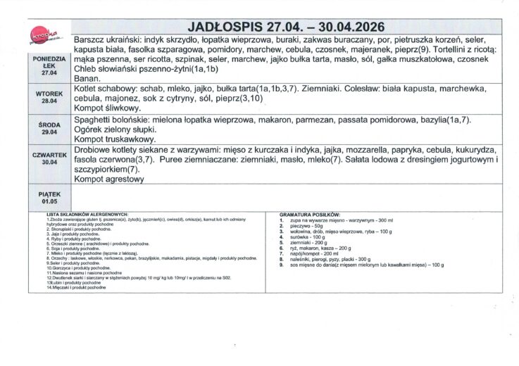 – JADŁOSPIS 27.04. – 30.04.2026 r.