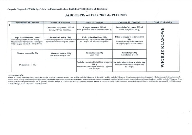 • Jadłospis od 15 do 19 grudnia 2025r.