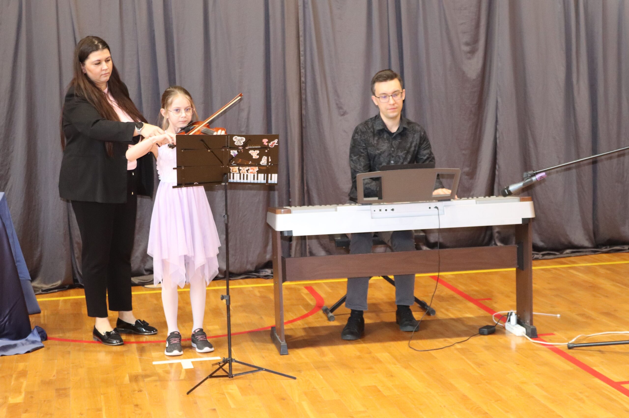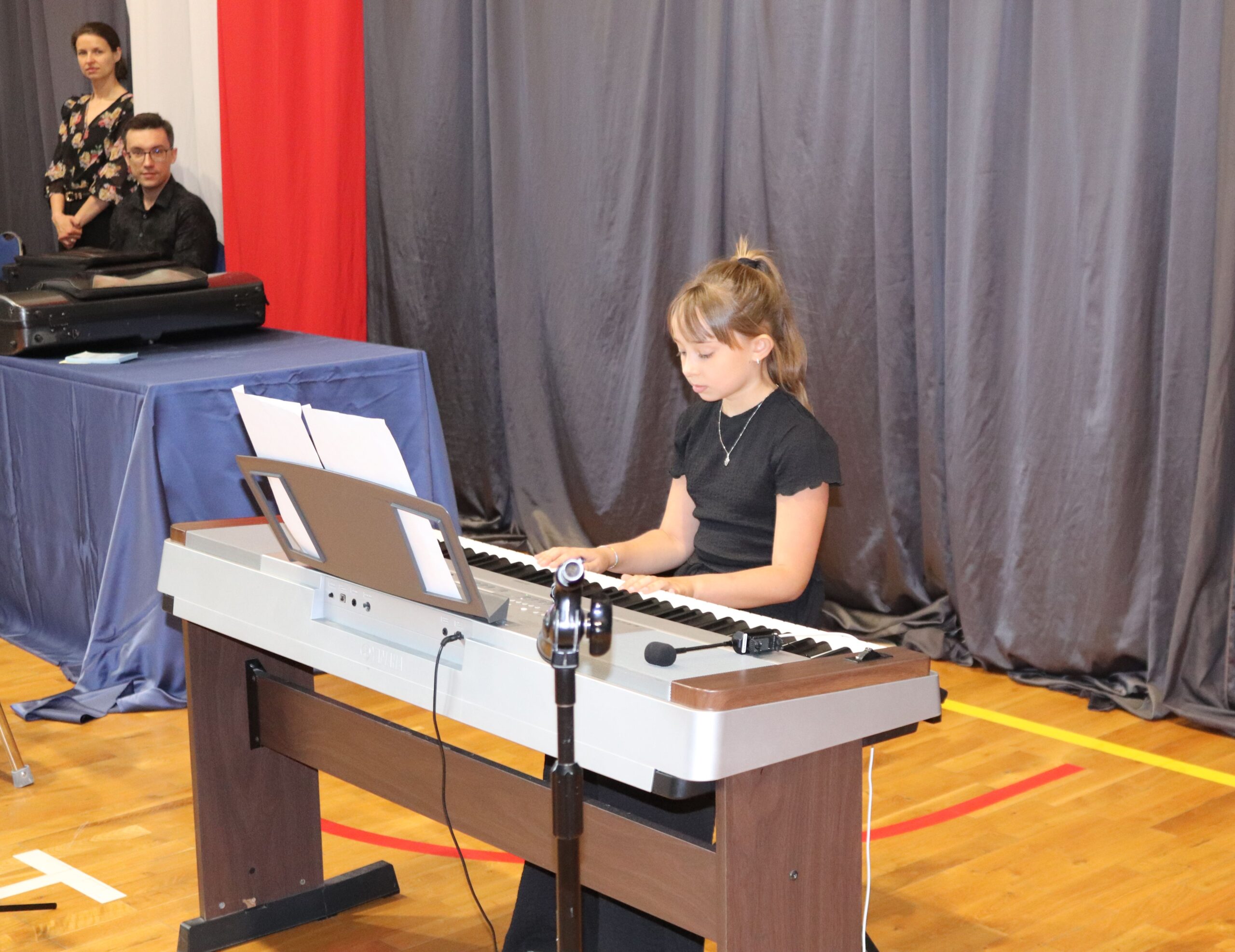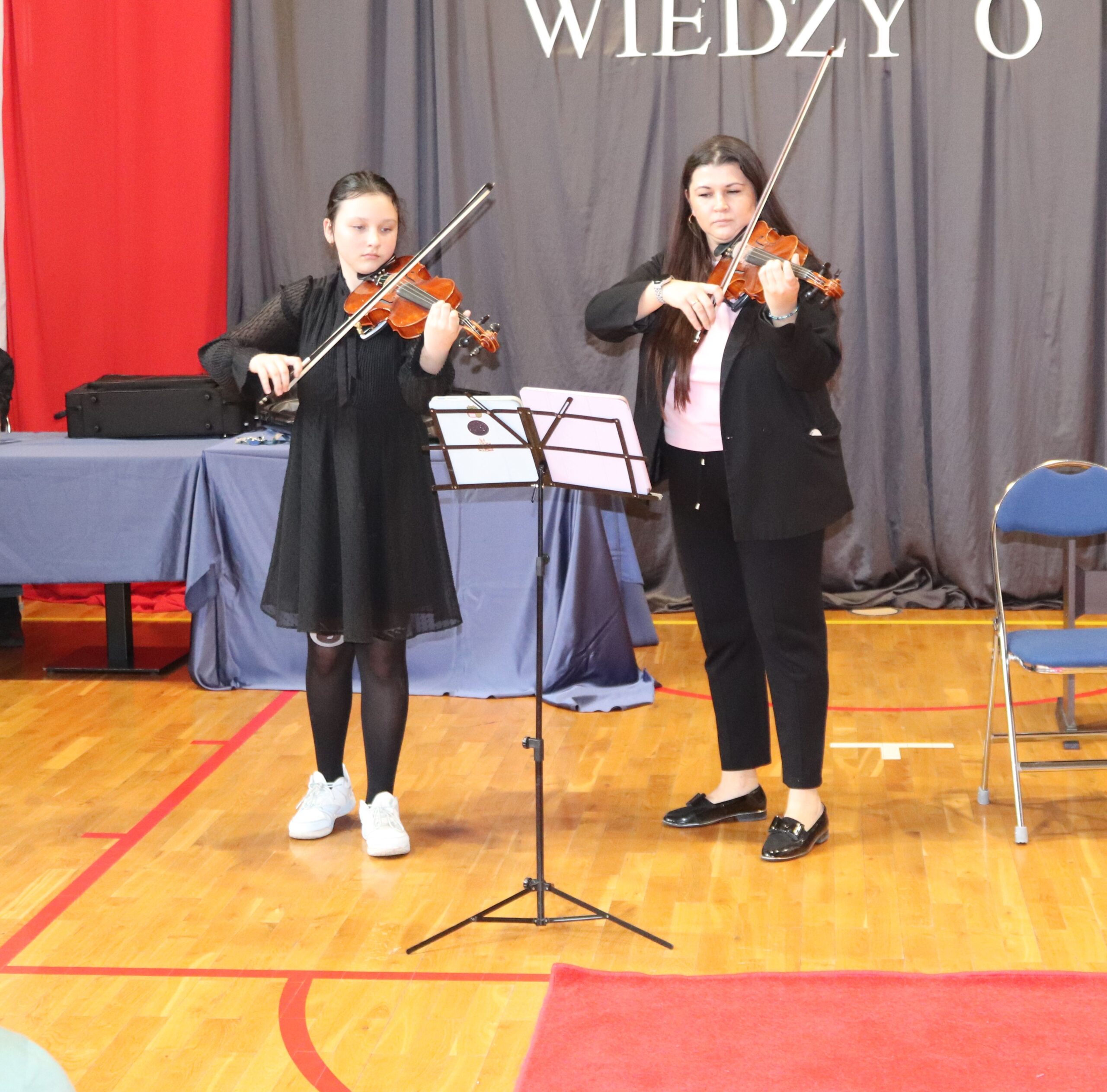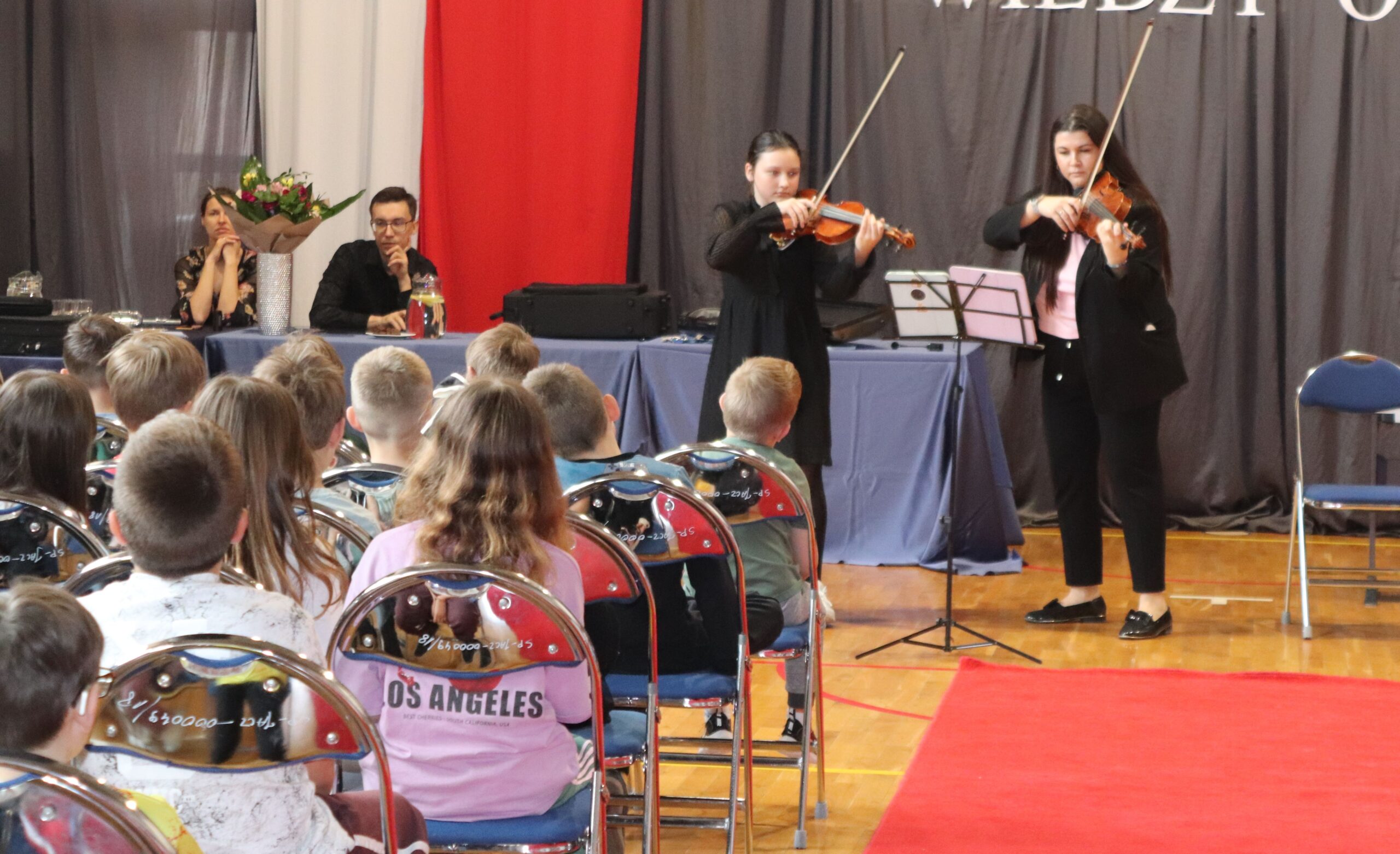 Podczas koncertu zaprezentowali się również uczniowie naszej szkoły: na pianinie Jagoda Nadymus, na skrzypcach Lena Kuczyńska oraz Nadia Gawlik, na akordeonie Jadwiga Gargol, a na flecie Milena Gawlik. Mogliśmy także podziwiać niezwykły duet mamy i córki – Leny oraz pani Katarzyny Kuczyńskiej.