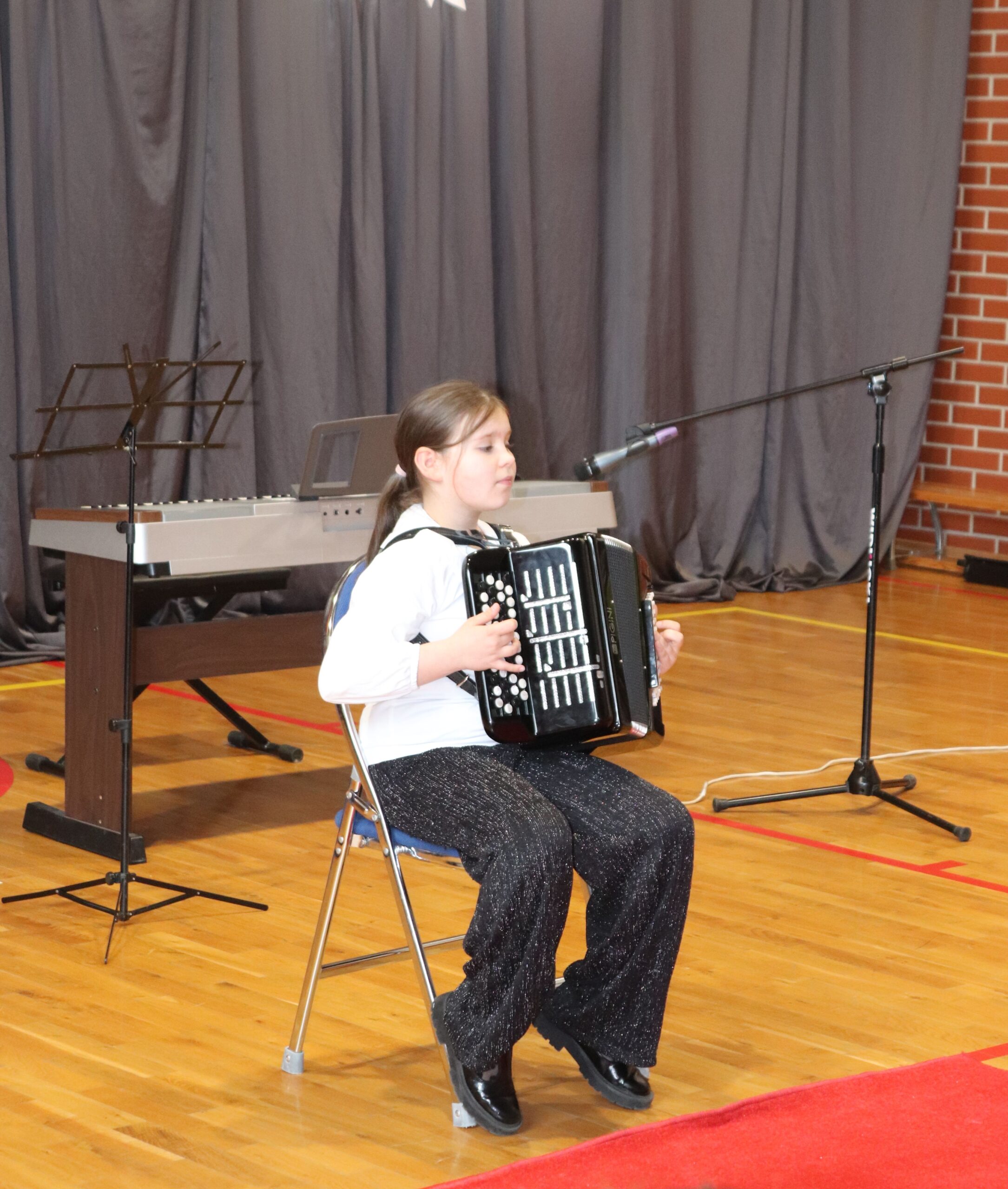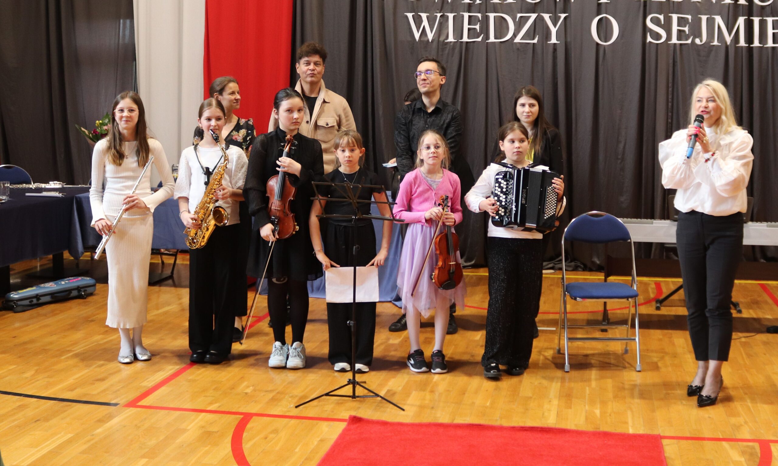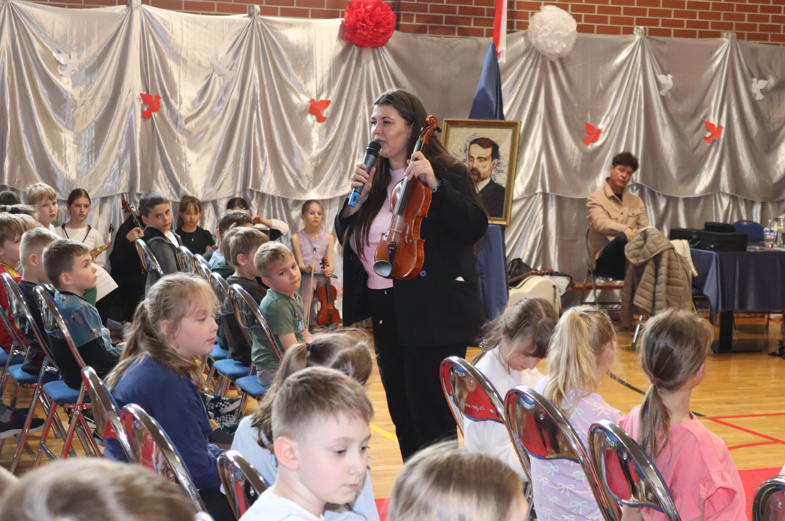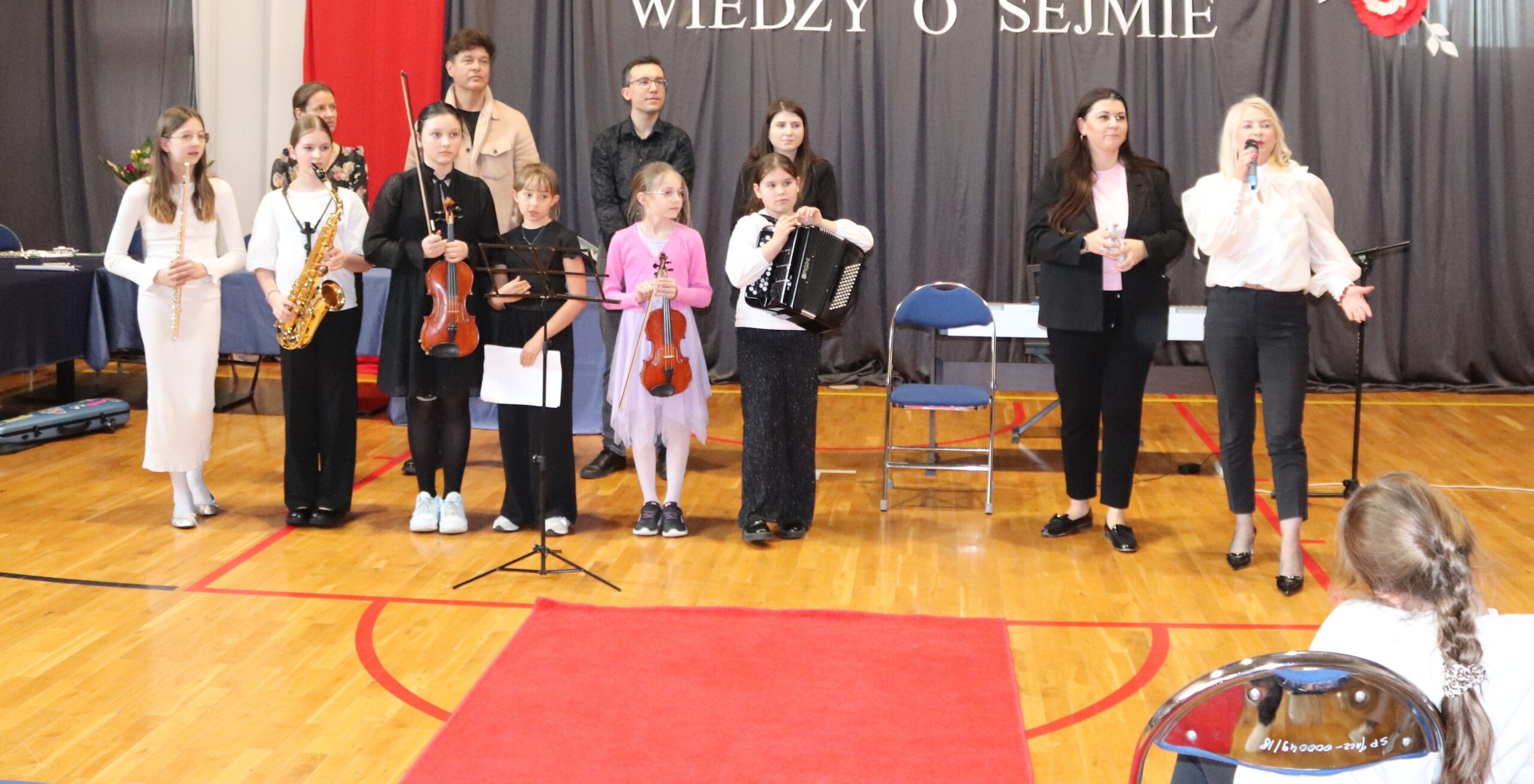 Podczas koncertu zaprezentowano różnorodne instrumenty muzyczne, takie jak skrzypce, pianino, flet, trąbka, akordeon oraz gitara. Dzieci miały okazję nie tylko poznać ich brzmienie i dowiedzieć się, jak wygląda nauka w szkole muzycznej, ale także samodzielnie spróbować gry na niektórych z nich. Wysłuchaliśmy wielu ciekawych utworów, które zachwyciły publiczność i pozwoliły poczuć magię muzyki na żywo.