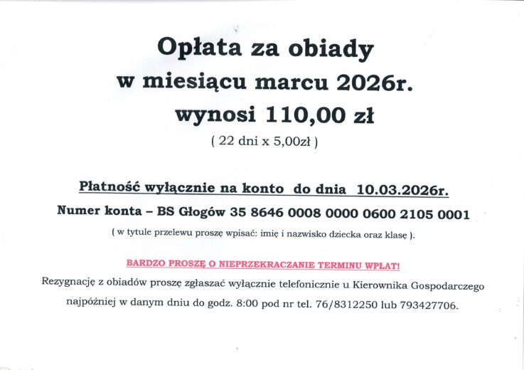• Koszt za obiady w miesiącu marcu 2026r.