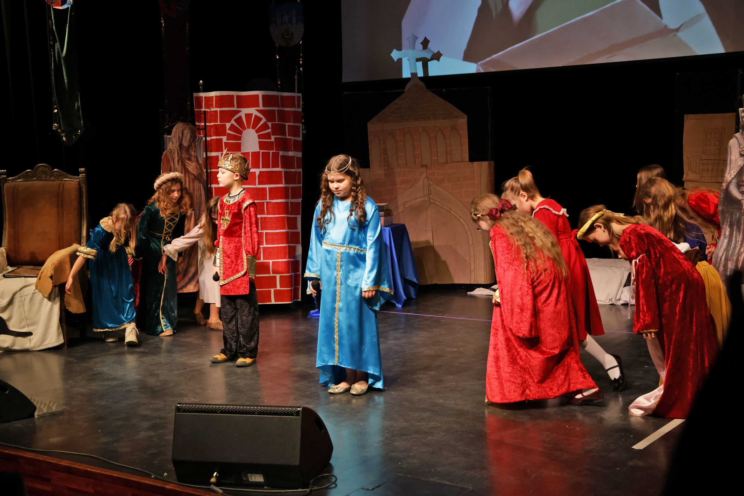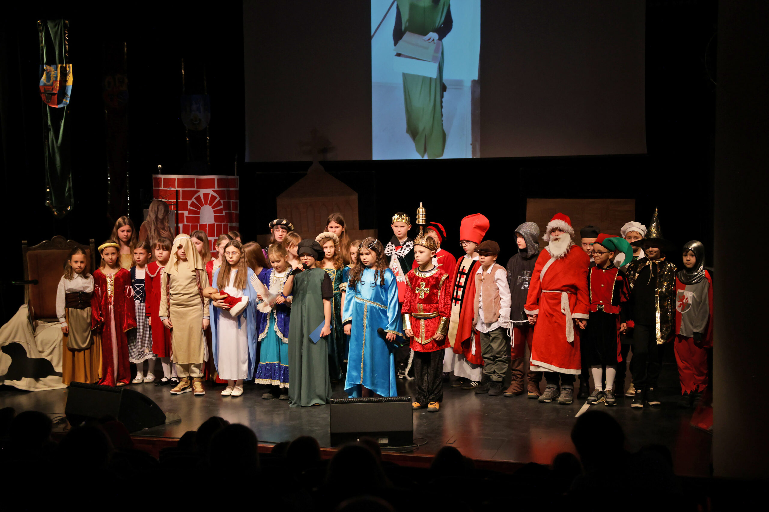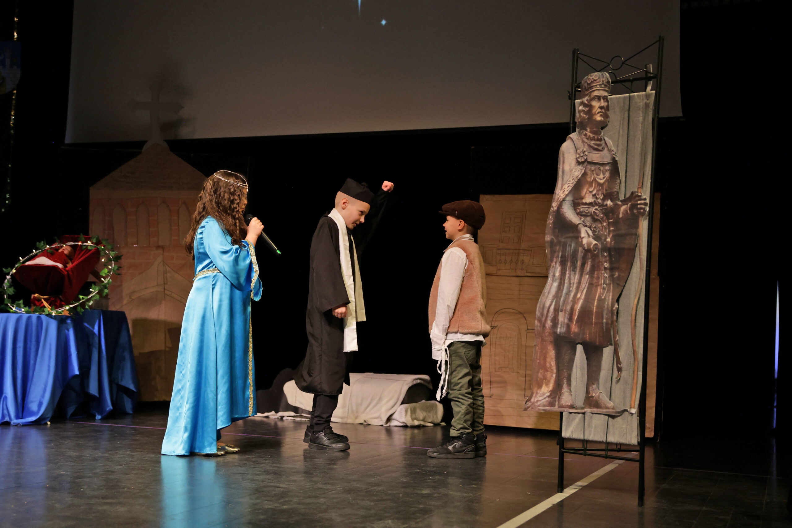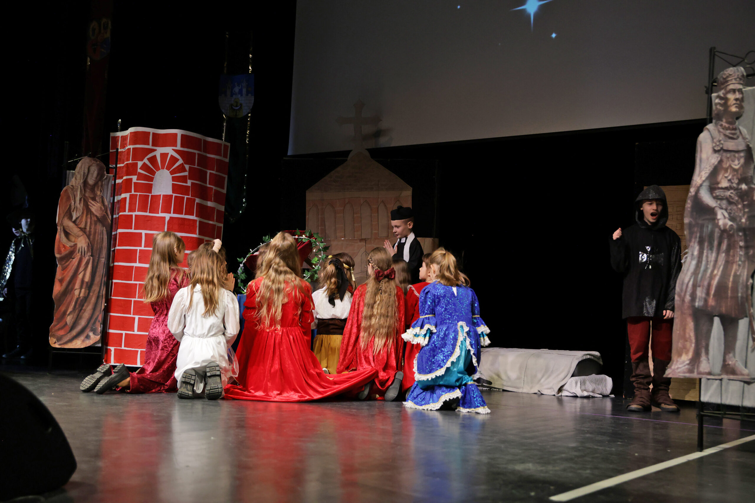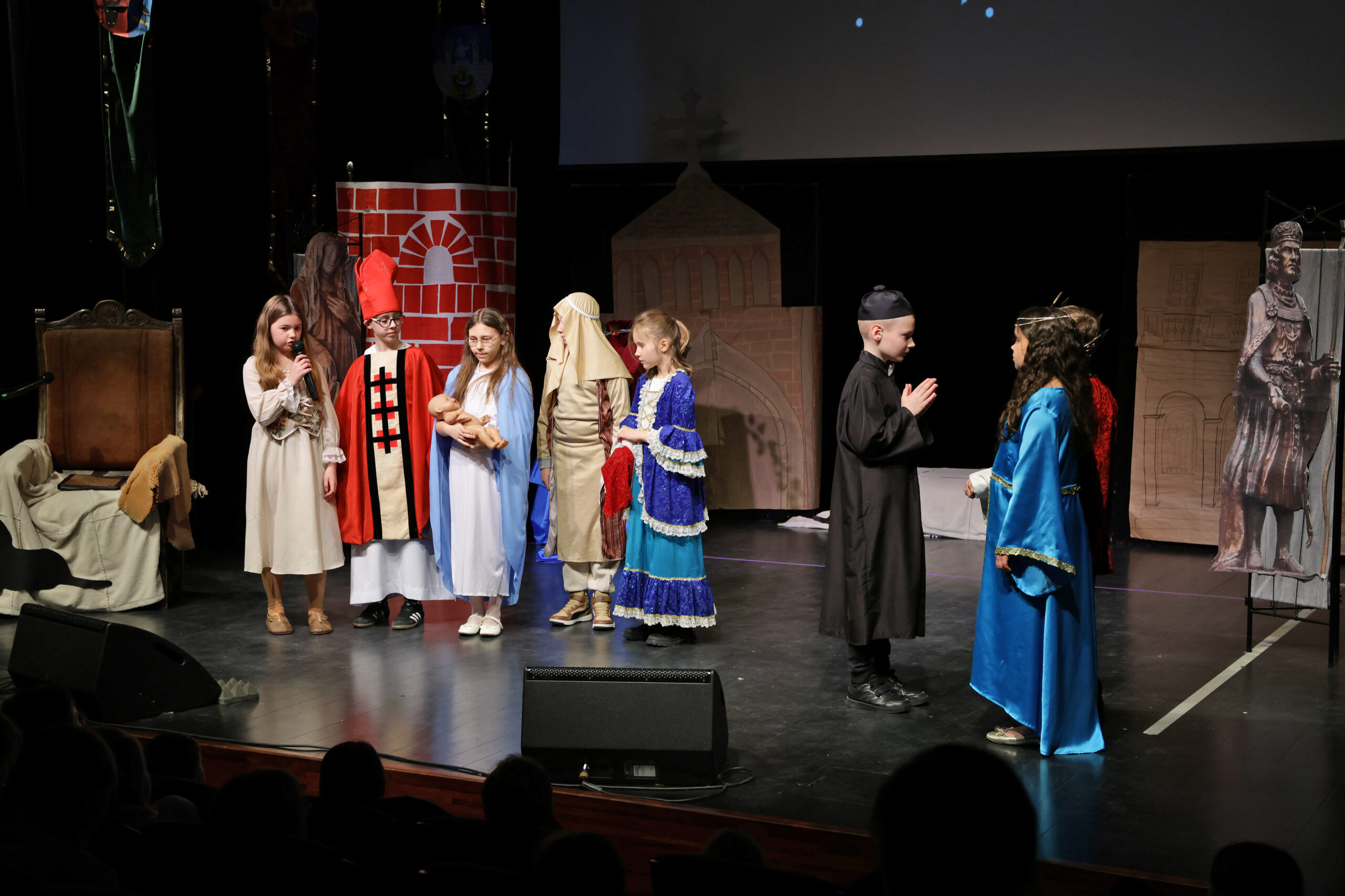 Obejrzeliśmy z zachwytem historię Salomei i Konrada I, gdzie drewniane posągi ożyły w pięknej grze naszych uczniów klas trzecich.
